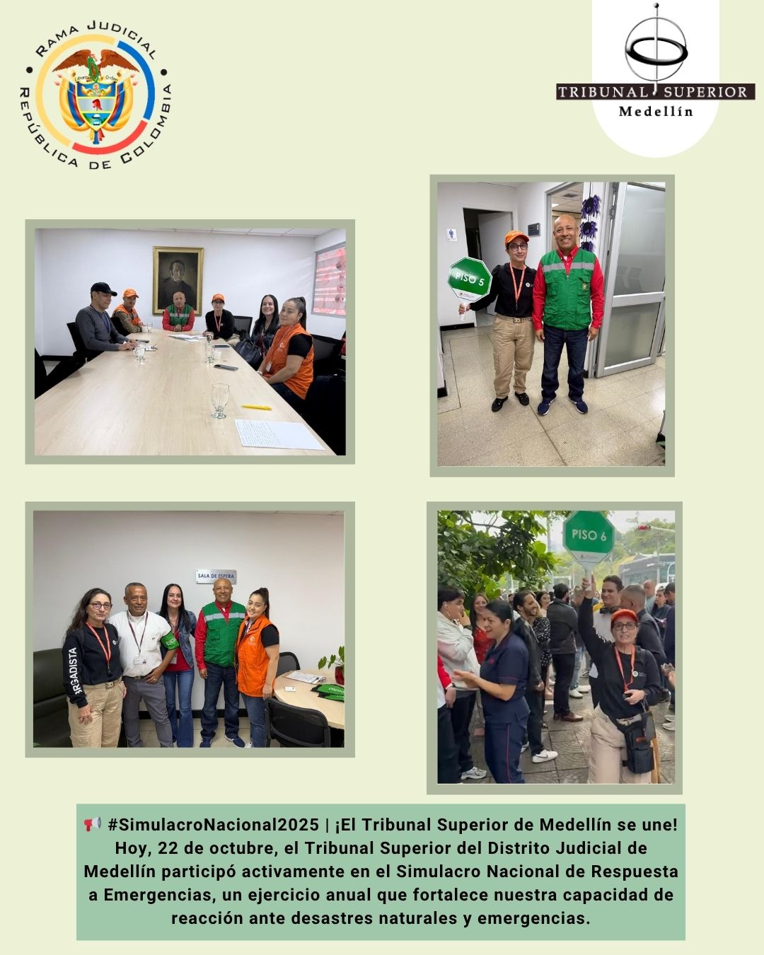 Hoy, 22 de octubre, el Tribunal Superior del Distrito Judicial de Medellín participó activamente en el Simulacro Nacional de Respuesta a Emergencias, un ejercicio anual que fortalece nuestra capacidad de reacción ante desastres naturales y emergencias.