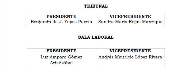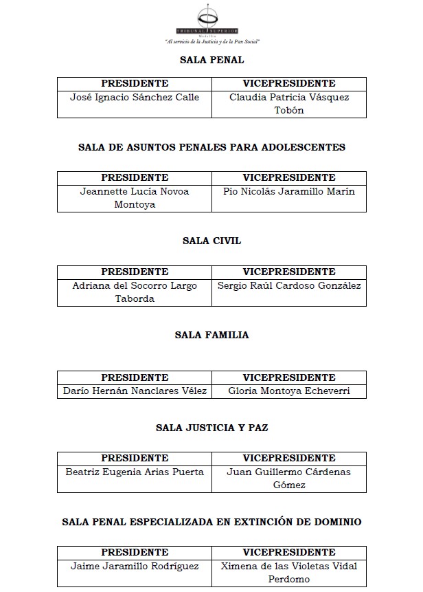 - La Presidencia del Tribunal Superior de Medellín se permite informar que, en sesión ordinaria de Sala Plena del día 21 de enero de 2026 mediante acta Nº 01, eligió nuevos dignatarios para el periodo comprendido del 1º de febrero de 2026 al 31 de enero de 2027, siendo designado como presidente el MAGISTRADO BENJAMÍN DE J. YEPES PUERTA: