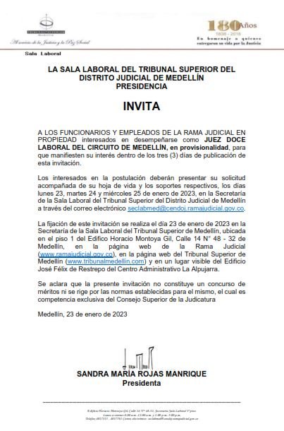 LA PRESIDENCIA DE LA SALA LABORAL DEL TRIBUNAL SUPERIOR DEL DISTRITO JUDICIAL DE MEDELLÍN INVITA A LOS FUNCIONARIOS Y EMPLEADOS DE LA RAMA JUDICIAL EN PROPIEDAD interesados en desempeñarse como JUEZ DOCE LABORAL DEL CIRCUITO DE MEDELLÍN, en provisionalidad, para que manifiesten su interés dentro de los tres (3) días de publicación de esta invitación.