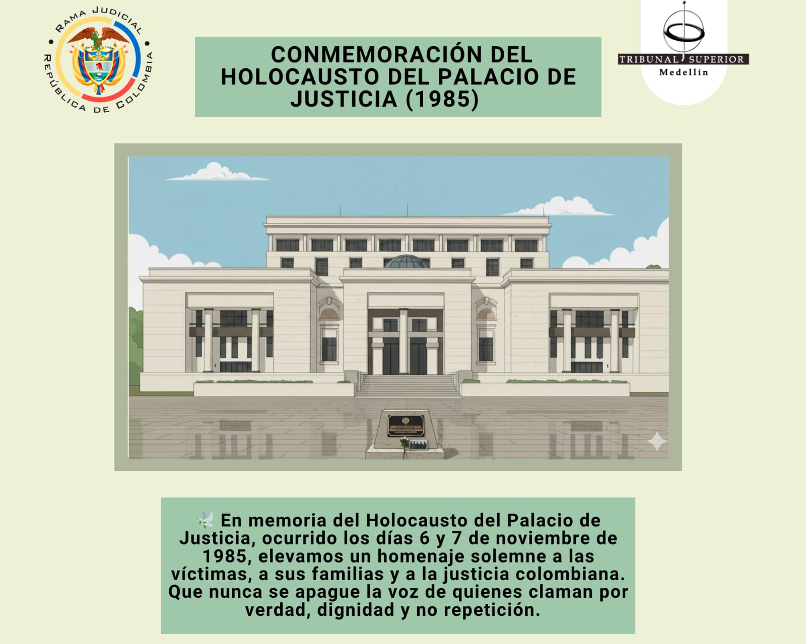 🕊️ "Hoy recordamos con profundo respeto y dolor el Holocausto del Palacio de Justicia, ocurrido los días 6 y 7 de noviembre de 1985. En esas jornadas trágicas, la justicia colombiana fue herida y muchas vidas fueron arrebatadas. Honramos la memoria de los magistrados, servidores judiciales, trabajadores y ciudadanos que nunca regresaron, y reafirmamos nuestro compromiso con la verdad, la justicia y la no repetición. Que este recuerdo nos inspire a construir un país donde la democracia, la dignidad y los derechos humanos prevalezcan sobre la violencia."