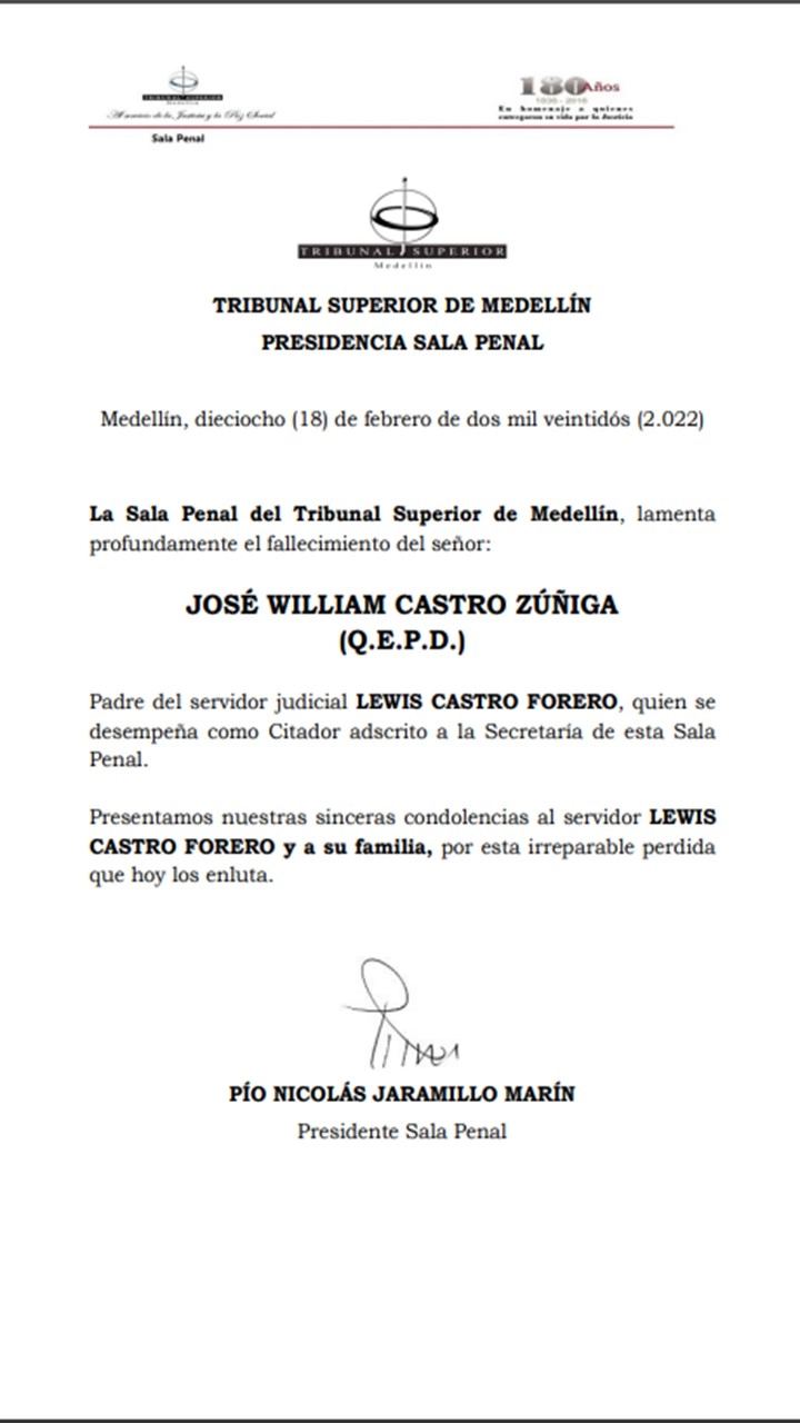 La Sala Penal del Tribunal Superior de Medellín, lamenta profundamente el fallecimiento del señor: JOSÉ WILLIAM CASTRO ZÚÑIGA (Q.E.P.D.) Padre del servidor judicial LEWIS CASTRO FORERO, quien se desempeña como Citador adscrito a la Secretaría de esta Sala Penal. Presentamos nuestras sinceras condolencias al servidor LEWIS CASTRO FORERO y a su familia, por esta irreparable perdida que hoy los enluta.