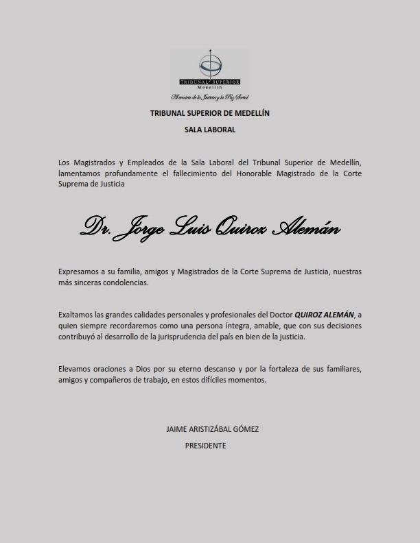 La Sala Laboral del Tribunal Superior de Medellín lamenta el fallecimiento del Magistrado de la Honorable Corte Suprema de Justicia, Doctor JOSÉ LUIS QUIROZ ALEMÁN, extendiendo las más sentidas condolencias a su familia, amigos y compañeros.